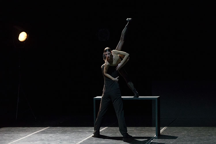 • … neatly arranged small ensemble piece featuring rigid steps softened by gorgeous rippling limbs that create a kind of sensual robot effect. Its structure builds around a series of punchy duets … in a ferociously intense battle atop a table; legs and torsos were whacked about with frightening speed and magnificent timing.